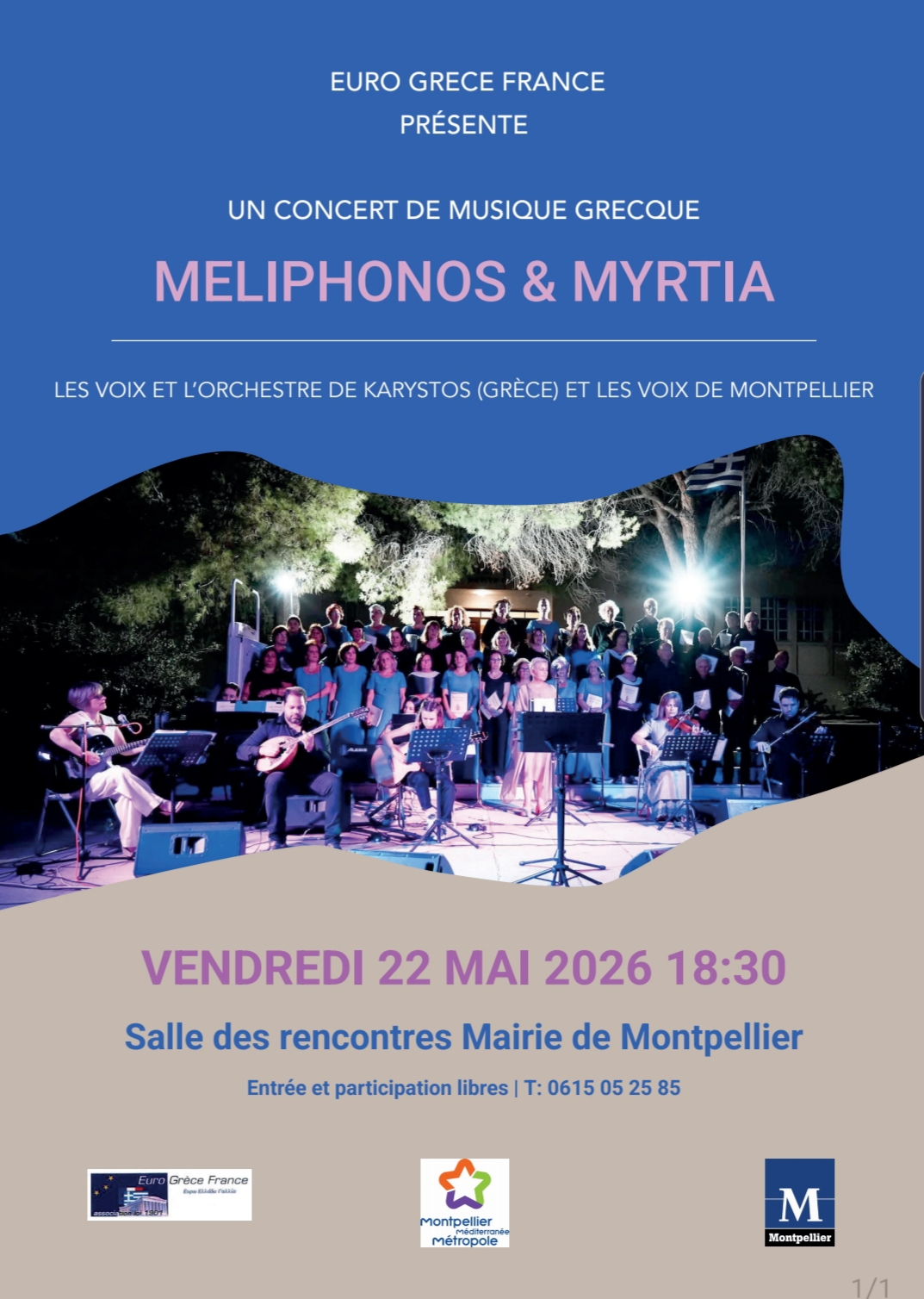 Les voix et l’orchestre de Karystos Meliphonos s’unissent aux voix des chanteurs de la chorale Myrtia d’Euro-Grèce-France pour un concert à Montpellier.